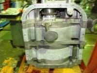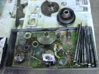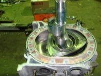 ローターハウジング・スポーツキット。テンションボルト及びオイルポンプ、カウンターウエイト、ギアトレーン。右の写真はフロントローター組み付け